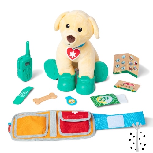 Go on pretend search and rescue adventures with an adorable canine companion! The Let’s Explore™ Ranger Dog plush pup comes ready to explore the great outdoors, thanks to the included protective shoes and safety vest (also fits most kids as a belt!) filled with rescue gear like a first-aid kit, bandages, wipes, play treat, and a play walkie-talkie with real sound effects! There’s also a certification card and activity booklet to help spark adventure ideas. Little adventurers ages 3 and older can pretend play the day away when the Let’s Explore Ranger Dog comes home to stay!