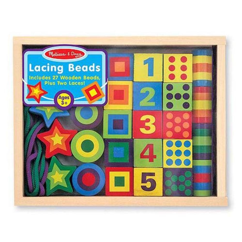 You can count on this wooden bead set to make a bold statement! The variety of these dramatic bead shapes, their bold colors and two extra-long laces make stringing beads extra special. Twenty-seven hand-painted beads feature 1 - 10 as numerals and as countable dots to add counting fun to this lacing activity.