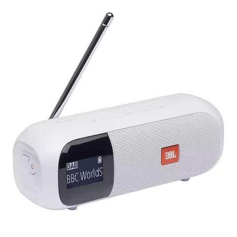 In the kitchen. By the pool. At the park. Now you can take your favorite DAB/DAB+/FM radio stations wherever the day takes you. The sleek JBL Tuner 2 is a compact portable radio with crystal clear sound Bluetooth and 12 hours of playtime. Quickly tune to your favorite stations with 5 preset buttons and easy-to-read station information on the scrolling LCD display. It's rated IPX7 waterproof and ready for the outdoors so even in a sudden rainstorm there's no need to stress. Listen for hours. From news and weather in the morning to music and entertainment at night.